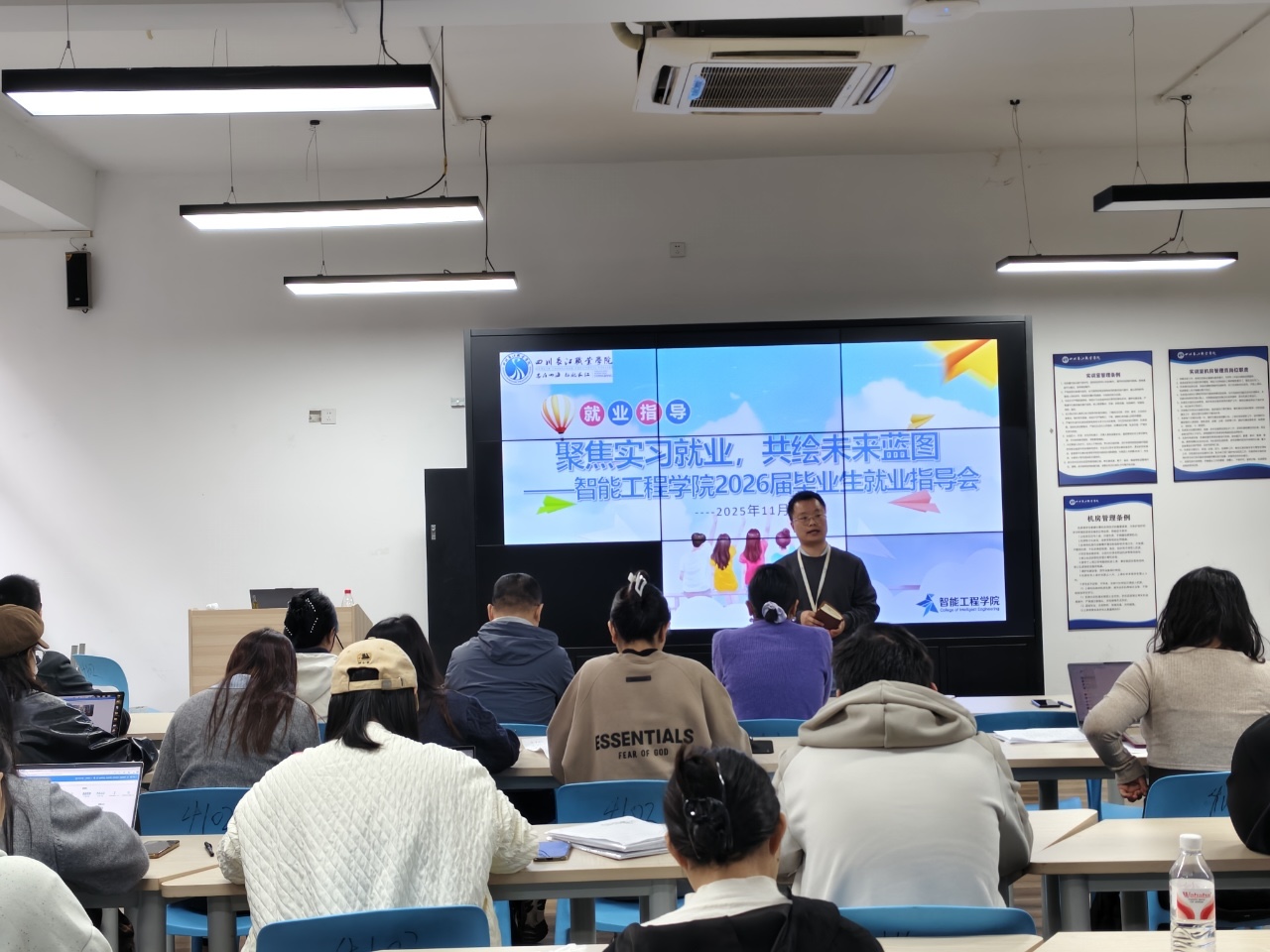 【本网消息】(智能工程学院 许露供稿)11 月 3 日,我院在4102教室举办主题为 “聚焦实习就业,共绘未来蓝图” 的就业指导会。本次会议有学院副院长孙安民、学校就业指导中心主任陈文、学院就业指导老师熊仕全、2026届实习指导老师及2026 届部分毕业生代表参会。