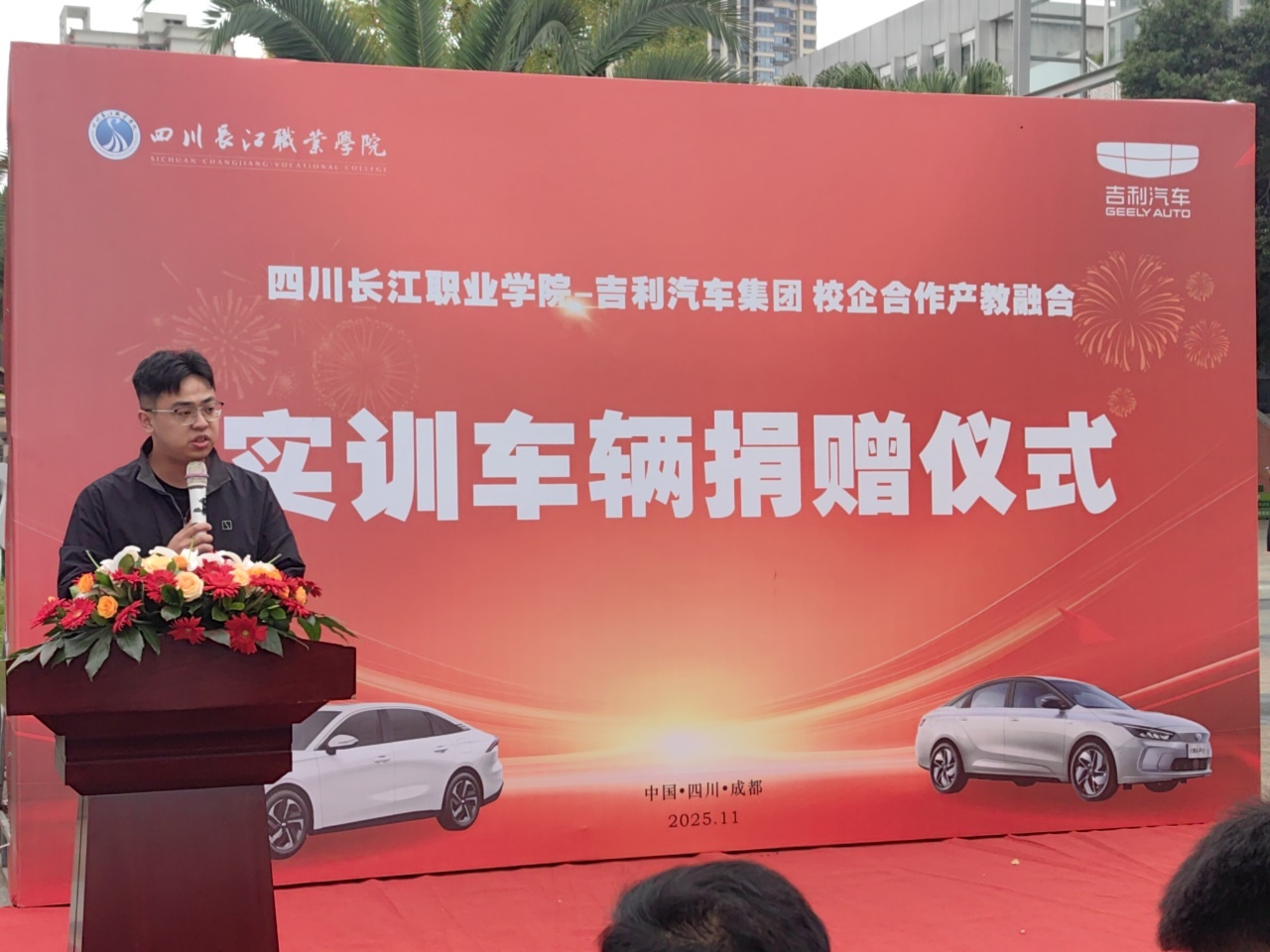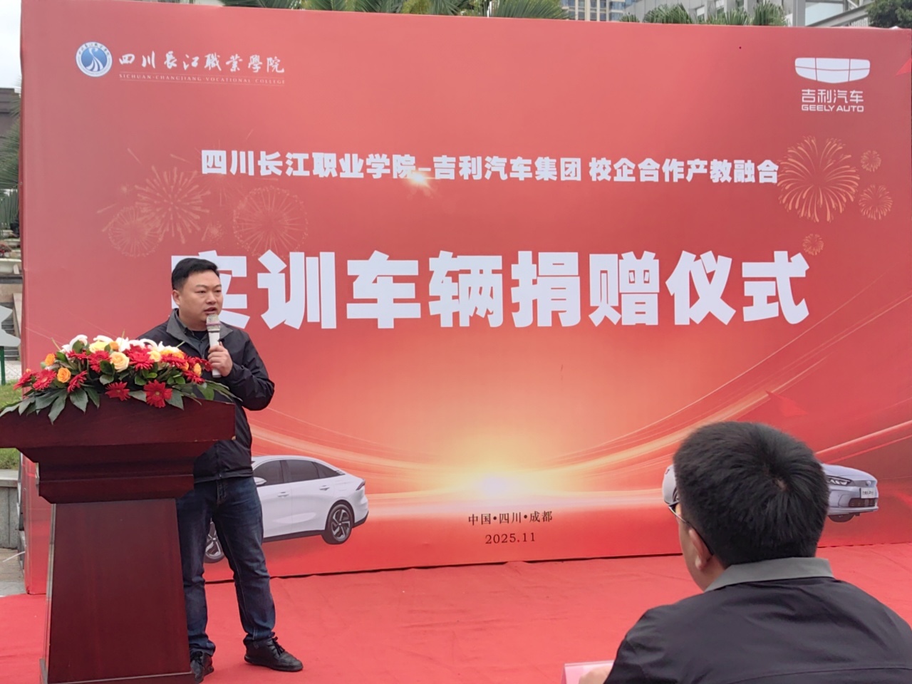 仪式开始由四川长江职业学院常务副校长耿兵致辞,耿校长表示首先非常感谢吉利集团的捐赠,此次捐赠标志着我校和吉利汽车集团深化产教融合,校企合作迈向新台阶新高度,更是吉利集团对我校产教融合育人模式的认可。今后双方将不断深化合作,引入企业资源和新技术,丰富实训设施设备,为我校智能网联与新能源汽车专业发展添砖加瓦,同时我校将一如既往持续为企业和区域汽车产业发展提供优质的高技能人才。