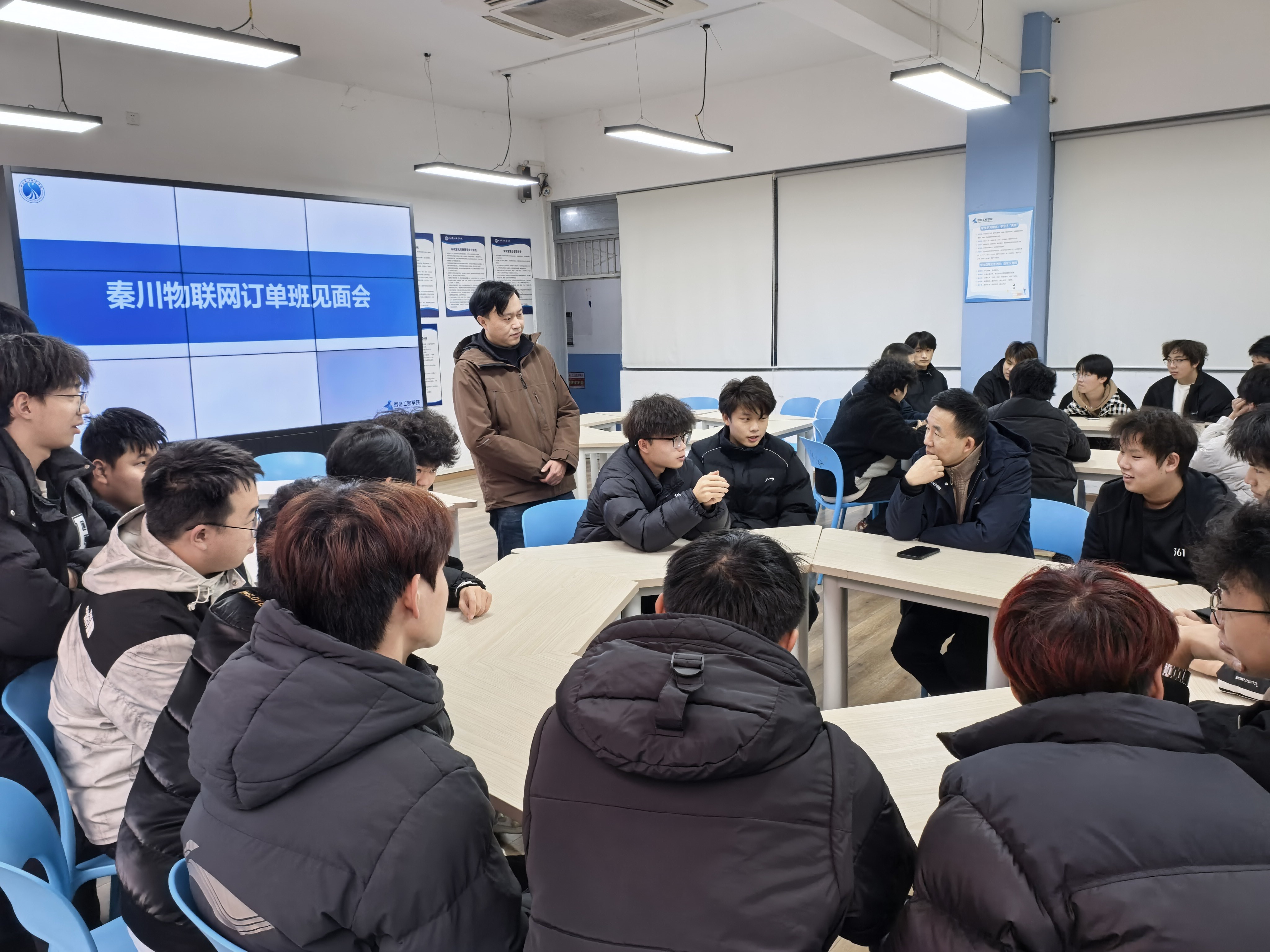 【本网消息】(智能工程学院葛木尧供稿)12月16日,为深化校企协同育人机制,精准对接产业高质量发展对技术人才的需求,秦川物联网有限公司经理刘彬、龙青燕带队,携公司资深工程师走进智能工程学院,围绕订单班人才培养与我院开展深度研讨,并组织开展了订单班学生见面会,搭建校企育人与学生就业的双向沟通桥梁。