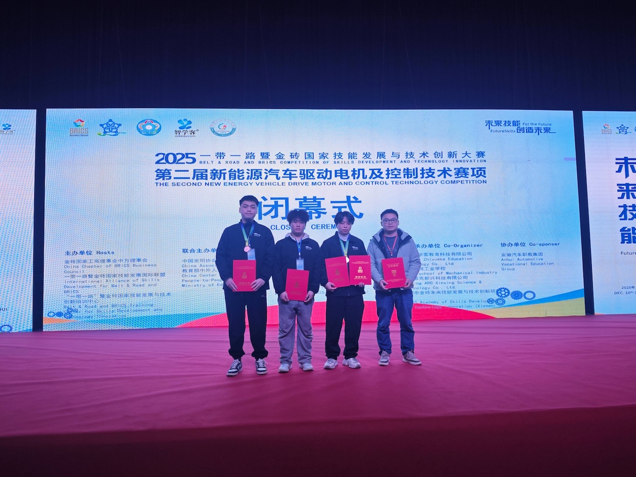 【本网消息】(智能工程学院 魏科飞供稿)12月12日,2025一带一路暨金砖国家技能发展与技术创新大赛,第二届新能源汽车驱动电机及控制技术赛项(高校组),在安徽工业机械学校举行。智能工程学院智能汽车系张政俊、彭钰伟、郑子奇三位同学同学,在与102所院校208支队伍角逐中,再获佳绩,分别斩获二等奖、三等奖和优秀奖的佳绩,并为学校带来优秀组织奖的荣誉。