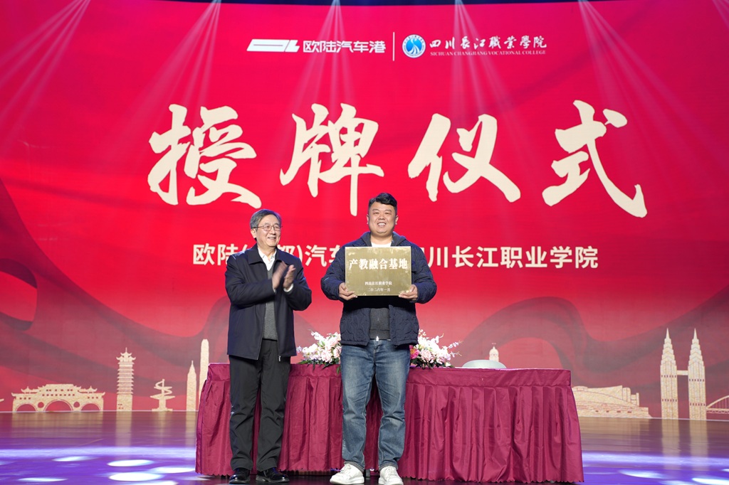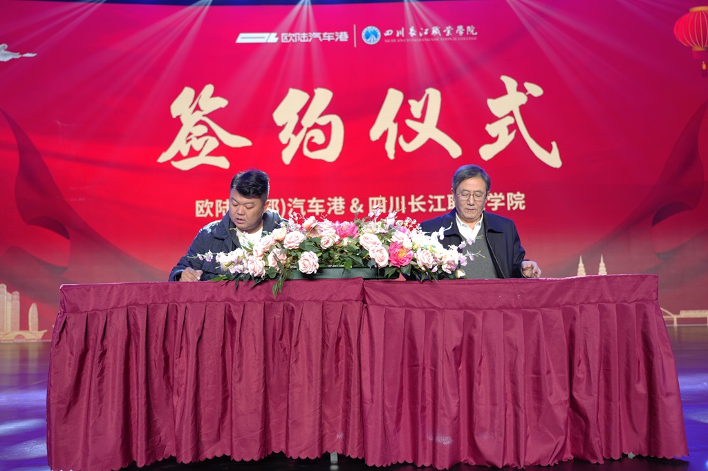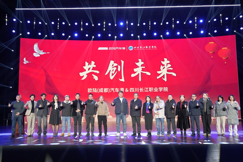 【本网消息】(智能工程学院 汪小孟供稿)2026年1月5日,四川长江职业学院与欧陆港(四川)国际汽车集团在欧陆汽车港微天府演播中心举行校企合作签约暨授牌仪式。欧陆汽车港(四川)国际汽车有限公司总经理肖雪峰、四川长江职业学院常务副校长耿兵、办公室主任王春燕、智能工程学院院长王真文、副院长张会、商贸与融媒体学院院长柯繁、智慧城市与低空应用学院体育工作部部长陈雪倩、汽车系主任汪小孟与教师代表及50名长江优秀学生代表共聚现场,共同见证合作新篇章的开启。