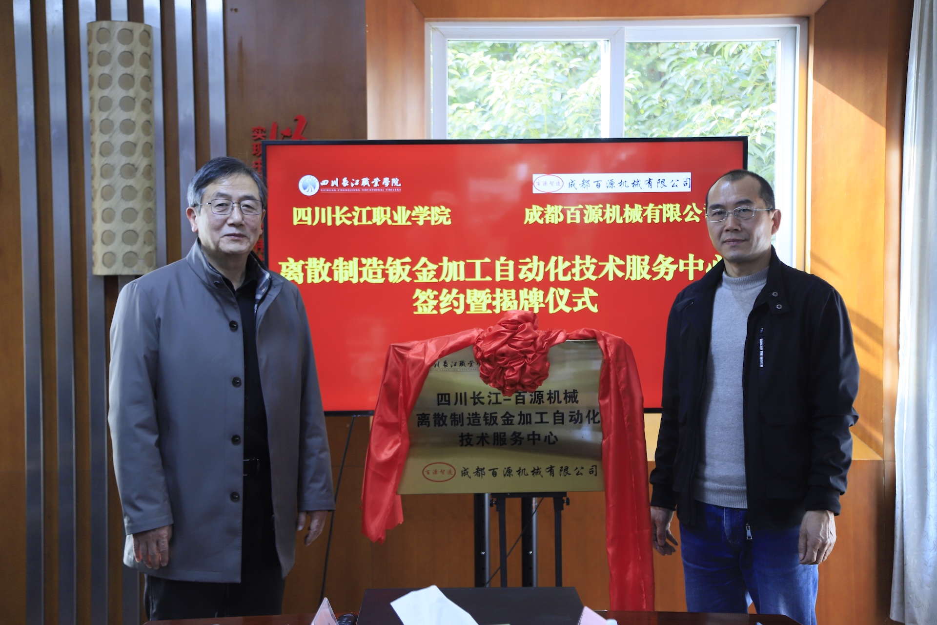 在与会代表的共同见证下,成都百源机械有限公司总经理黄勇与四川长江职业学院常务副校长耿斌共同为“长江—百源离散制造钣金加工自动化技术服务中心”揭牌。