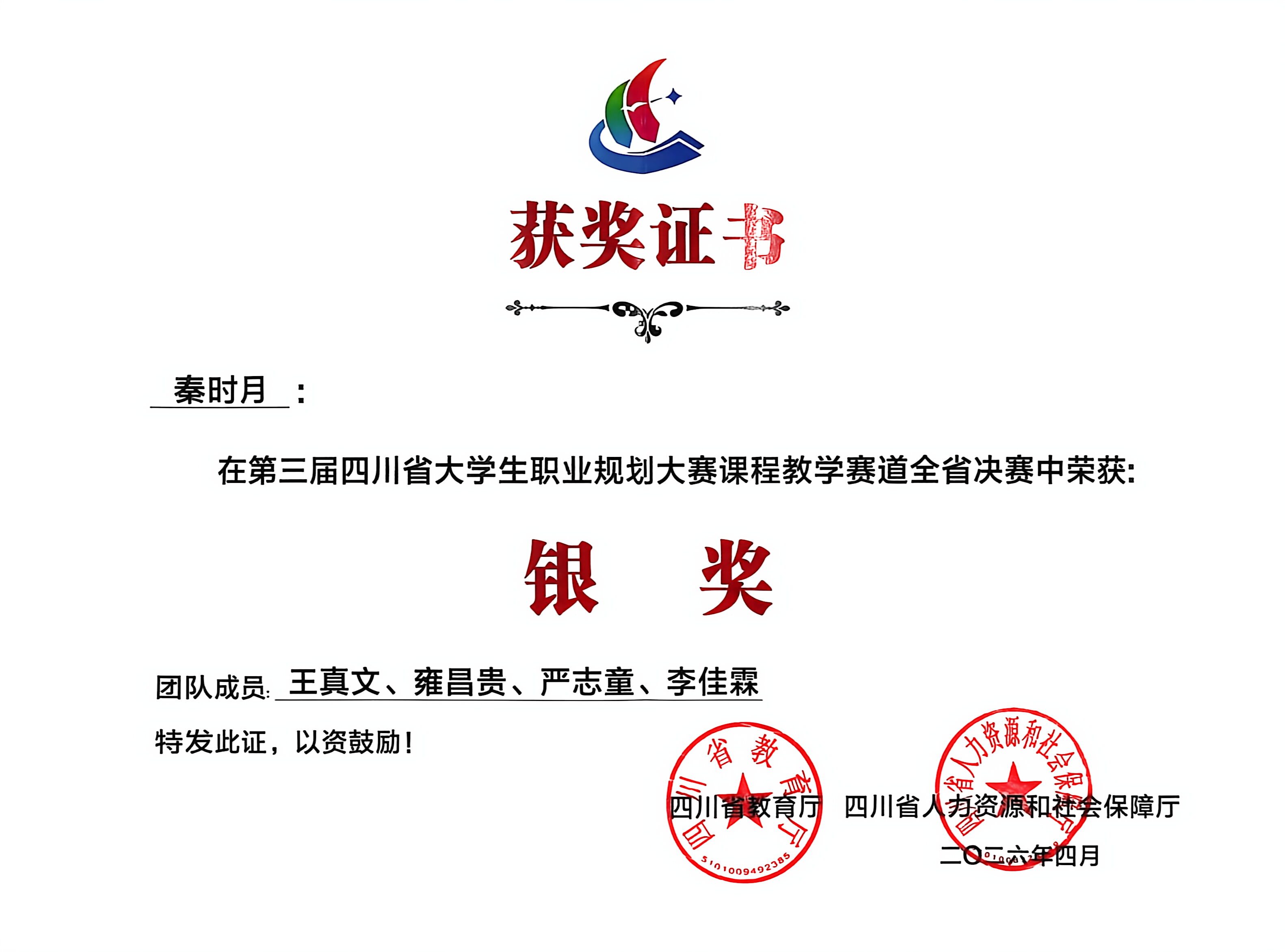 【本网消息】(智能工程学院 秦时月供稿)近日,由四川省教育厅和四川省人力资源和社会保障厅举办的第三届四川省大学生职业规划大赛课程教学赛道获奖结果正式公布。智能工程学院秦时月、王真文、严志童与智慧健康与管理学院李佳霖及企业专家雍昌贵组成的团队凭借扎实的教学积累、深度的产教融合及出色的现场表现,从全省30支参赛队伍中脱颖而出,荣获高教组银奖。