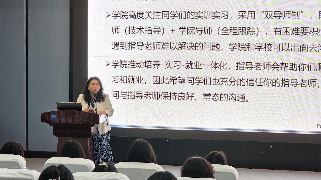 大会还围绕“岗位实习计划安排”“实习考核与学分认定”“政策解读与发展建议”“实习流程与成绩构成”“安全保障与行为规范”等多个方面展开。一是系统解读了实习周期、企业遴选标准与双导师制实施细则,强调校企协同育人机制在实习全过程中的关键作用;二是针对职场沟通礼仪、跨部门协作开展情景化指导,强化学生表达逻辑与应变能力;三是重点强调实习管理与考核机制全过程将通过“岗位实习平台”进行动态监控与评,数据留痕,确保实习质量可追溯、可评估;四是聚焦学生心理适应与职业认同,通过案例分享与心理测评工具应用,引导学生建立合理预期,缓解角色转换焦虑;五是围绕实习期间的安全问题,从遵纪守法、求职防骗、租房安全、网络安全、交通安全等多个维度提醒同学们增强自我保护意识,确保实习过程安全有序。